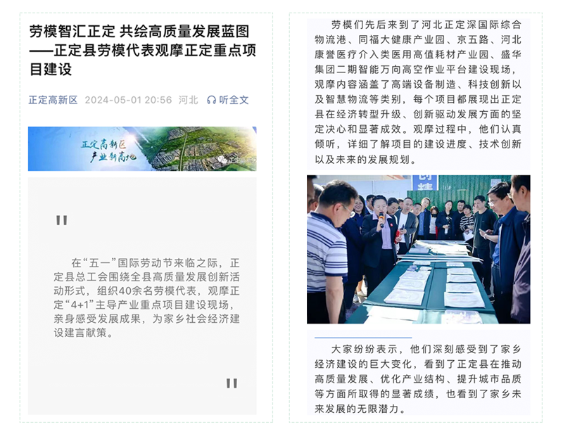 為了積極弘揚勞模精神,迎接“五一”國際勞動節(jié)的到來,正定縣總工會組織縣內(nèi)40余名勞模代表,實地觀摩正定“4+1”主導產(chǎn)業(yè)重點項目建設現(xiàn)場,切身感受近年來正定縣的發(fā)展新變化。康譽醫(yī)療介入類醫(yī)用高值耗材產(chǎn)業(yè)園作為受訪項目之一,進行了熱情接待和詳細的講解。新聞媒體正定高新區(qū)、正定發(fā)布(官方微信公眾號)對此次活動進行了相關報道。