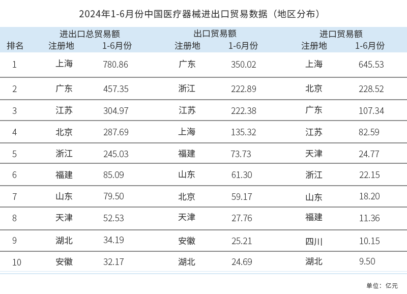 2024年1-6月份數(shù)據(jù)顯示,醫(yī)療器械進出口總貿(mào)易額,上海、廣東、江蘇位居前三,為我國醫(yī)械進出口貿(mào)易強省,三省市的貿(mào)易總額分別為780.85億元、457.35億元、304.97億元,合計占我國醫(yī)械進出口貿(mào)易總額的61.02%。