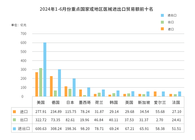 重點國家或地區(qū)貿(mào)易情況。根據(jù)2024年1-6月份總體數(shù)據(jù),中國醫(yī)療器械前三位的貿(mào)易伙伴為美國、德國和日本,中國對這三個國家的進出口貿(mào)易額均在百億元以上,其中美國為600.63億元,德國為308.64億元,日本為198.36億元;中國對這三個國家的進出口貿(mào)易總額合計為1107.23億元,占中國全球貿(mào)易總額的43.79%。從具體進口與出口的對比數(shù)據(jù)來看,2024年1-6月份醫(yī)械貿(mào)易,中國對美國的出口額為322.72億元,出口額為277.91億元,實現(xiàn)順差44.81億元;而對德國、日本均為貿(mào)易逆差,貿(mào)易逆差額分別為161.54億元、33.14億元。此外,值得注意的是,在中國醫(yī)療器械前十位的貿(mào)易伙伴中,中國對其進出口貿(mào)易實現(xiàn)逆差的國家還有墨西哥(58.28億元)、新加坡(3.17億元)、愛爾蘭(52.98億元)以及法國(2.69億元)。