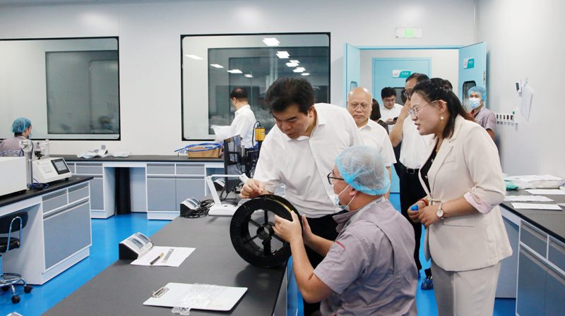 投產(chǎn)儀式后,王俊紅書記,省市縣各級領(lǐng)導(dǎo),正定縣鄉(xiāng)鎮(zhèn)、街道相關(guān)部門主要負責(zé)同志,在張總帶領(lǐng)下走進高標準萬級潔凈車間。王俊紅書記與工人們進行了親切交談,了解了注塑、擠出、編織等制造工藝。通過張總的詳細講解,大家對公司的研發(fā)創(chuàng)新、產(chǎn)品體系以及未來市場等情況有了更加全面的了解。