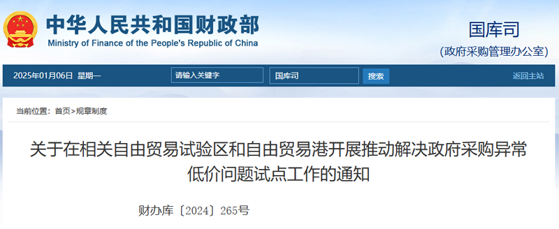 12月25日,國家財政部正式發(fā)布了《關(guān)于在相關(guān)自由貿(mào)易試驗區(qū)和自由貿(mào)易港開展推動解決政府采購異常低價問題試點工作的通知》(以下簡稱《通知》)。《通知》指出:為促進政府采購公平競爭,推進優(yōu)質(zhì)優(yōu)價采購,財政部決定在北京、天津、上海、福建、廣東自由貿(mào)易試驗區(qū)和海南自由貿(mào)易港開展推動解決政府采購異常低價問題試點工作。