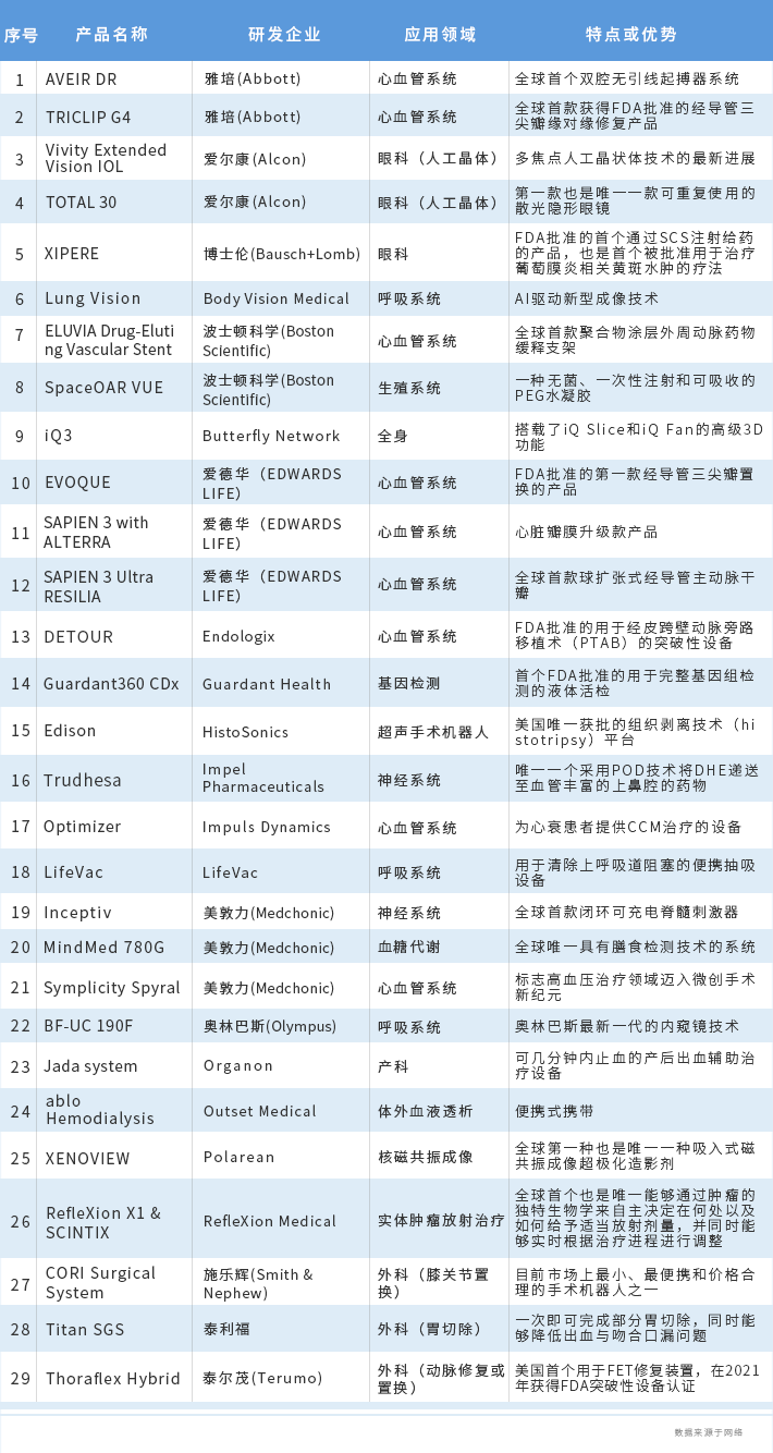 從上榜企業(yè)來(lái)看,美敦力、愛(ài)德華的入選產(chǎn)品最多,均有三款上榜;雅培、波士頓科學(xué)、愛(ài)爾康各有兩款產(chǎn)品。此外,泰爾茂、奧林巴斯、施樂(lè)輝等也有產(chǎn)品上榜。其中,心血管系統(tǒng)應(yīng)用領(lǐng)域,愛(ài)德華的Evoque(自膨脹式三尖瓣瓣膜),美敦力的Symplicity Spyral(射頻消融),雅培的AVEIR DR(全球首個(gè)雙腔無(wú)引線起搏器系統(tǒng))和TRICLIP G4(全球首款獲得FDA批準(zhǔn)的經(jīng)導(dǎo)管三尖瓣緣對(duì)緣修復(fù)產(chǎn)品)等多款產(chǎn)品備受矚目,市場(chǎng)需求旺盛,應(yīng)用前景廣闊。此外,除上述醫(yī)療技術(shù)(產(chǎn)品),還有不少創(chuàng)新醫(yī)療技術(shù)引起了大家的廣泛關(guān)注,比如華大基因首個(gè)獲得FDA批準(zhǔn)用于完整基因組檢測(cè)的液體活檢Guardant360 CDx。